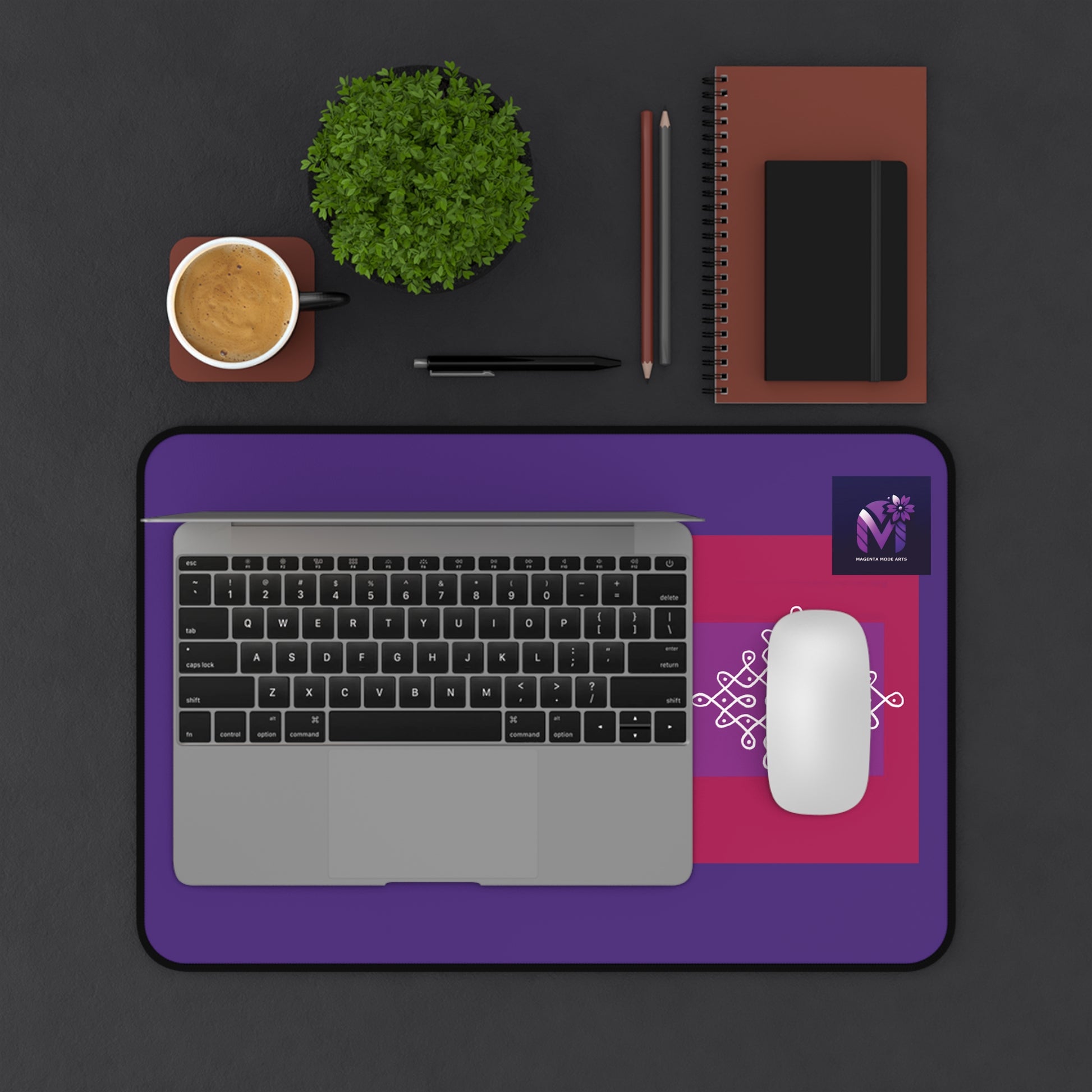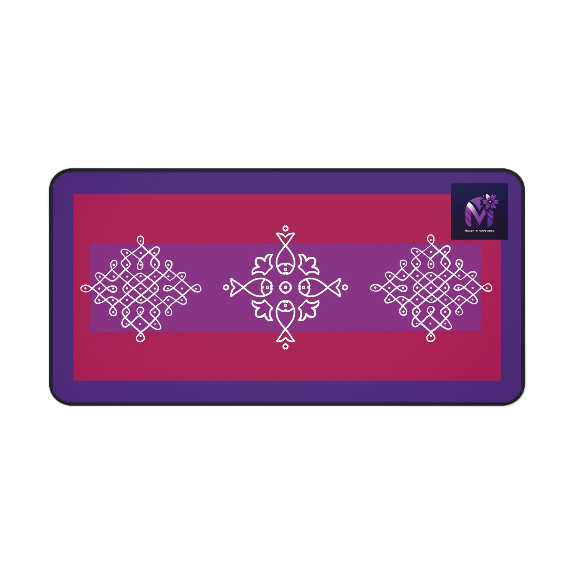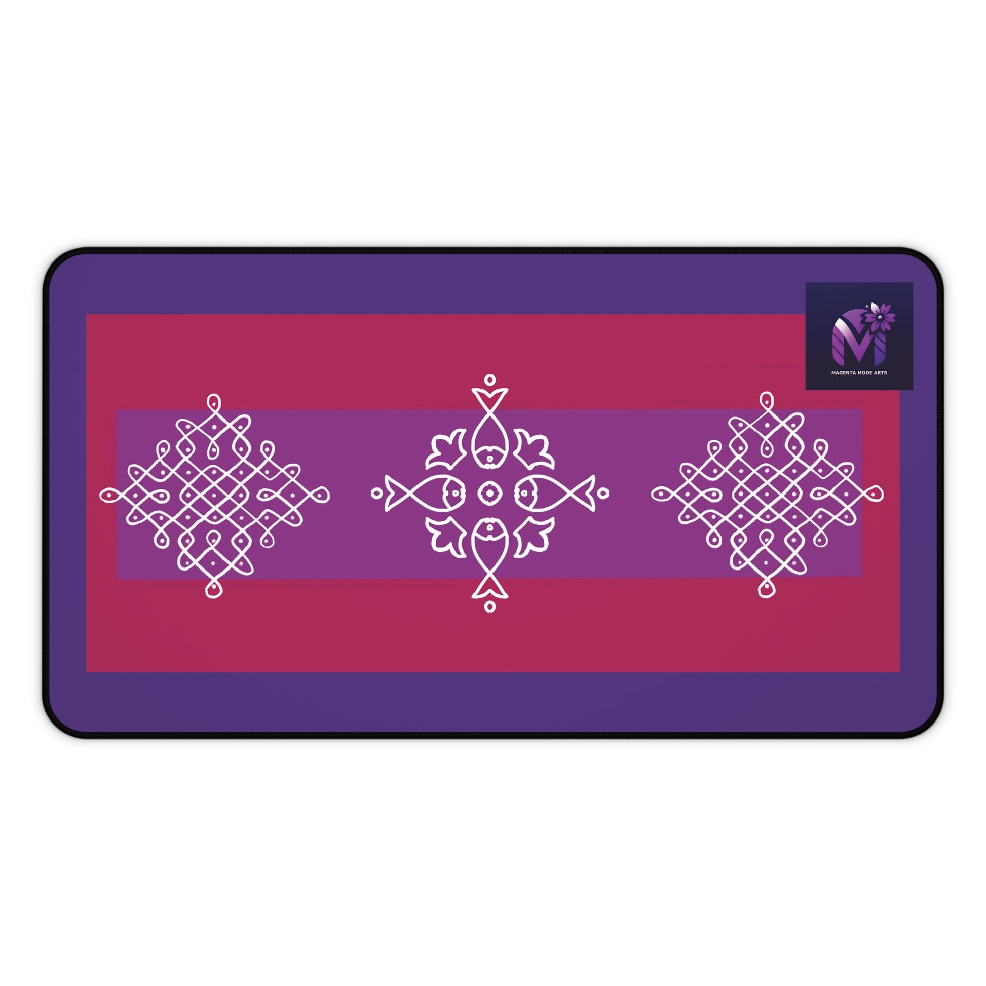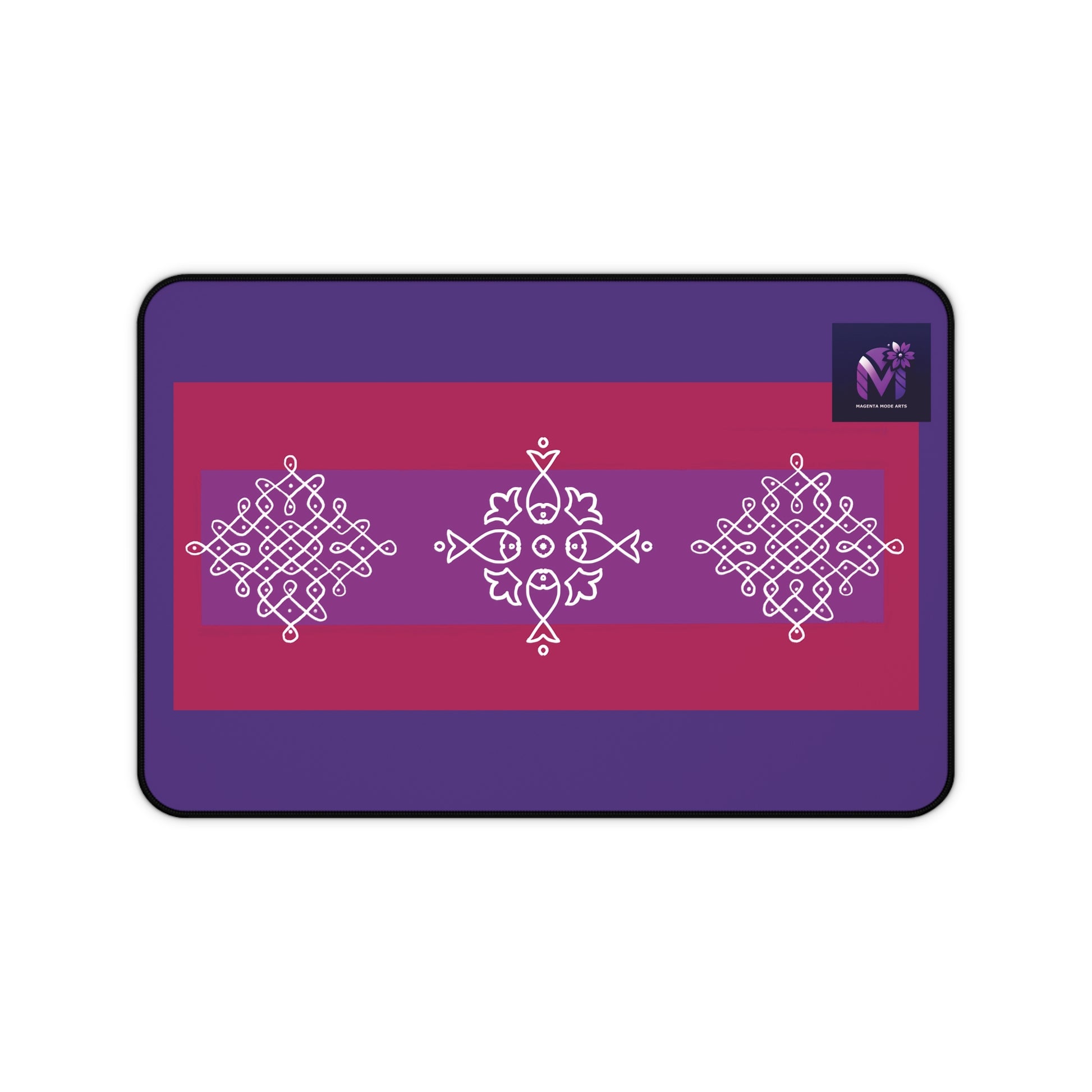 This desk mat featuring dots and curves traditional Kolam art print is the perfect choice for Corporate gifting with that extra personal touch or elegant choice in your home office or even great gifts for kids desk decor. Made of 3mm thick neoprene material, it has an anti-slip backing and a hemmed edge for durability and stability. Pick it in three sizes 12” × 18”, 12” × 22” & 31" × 15.5" and glow up your workspace.