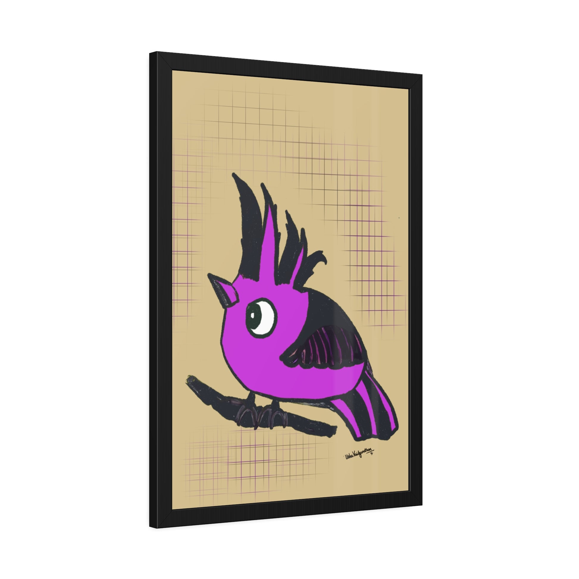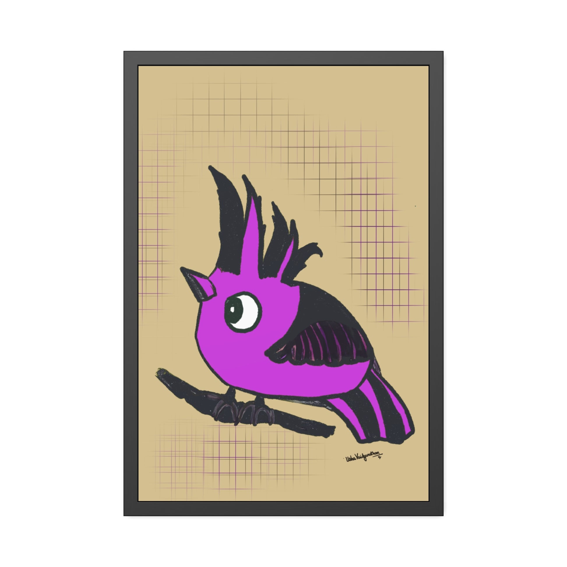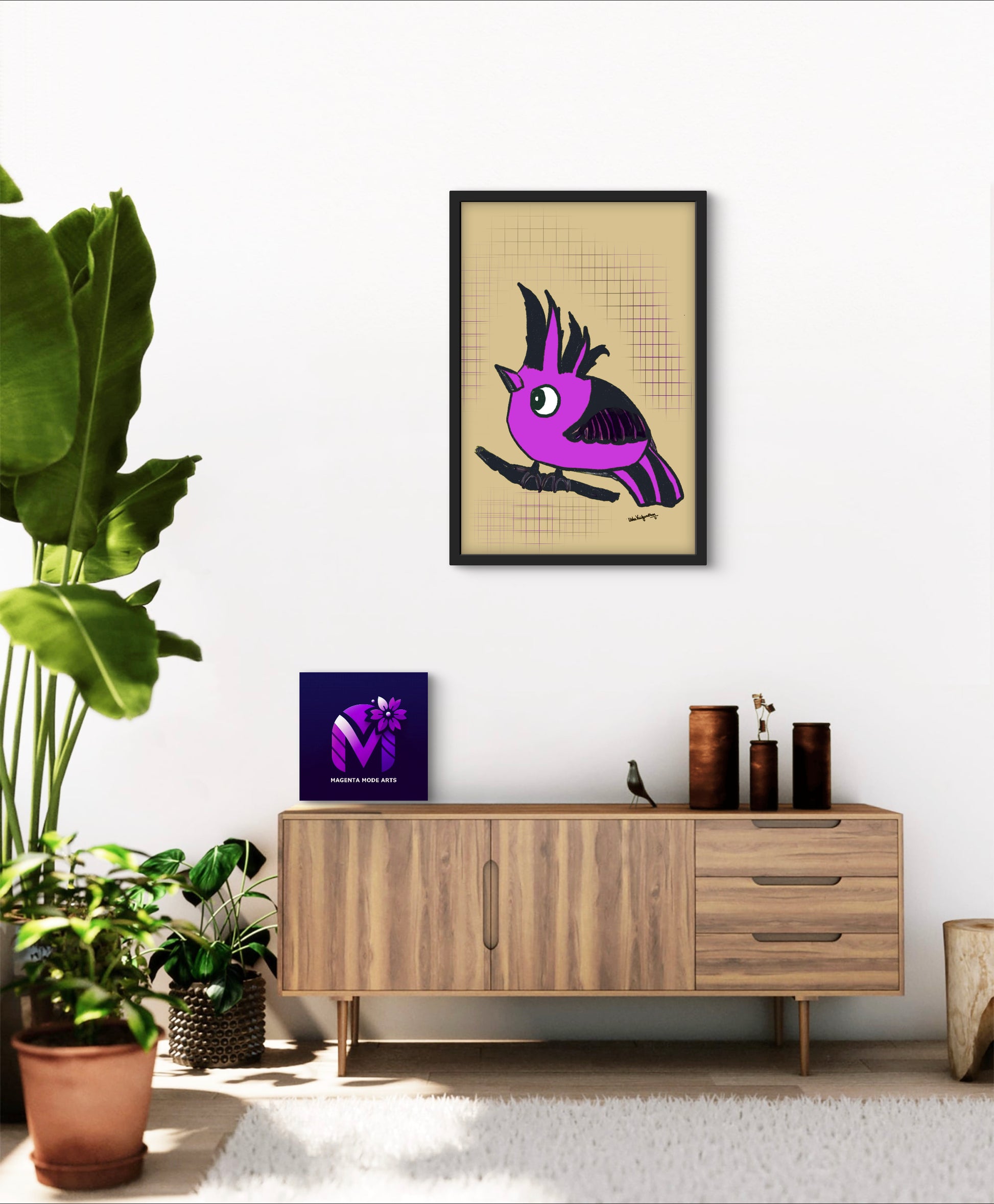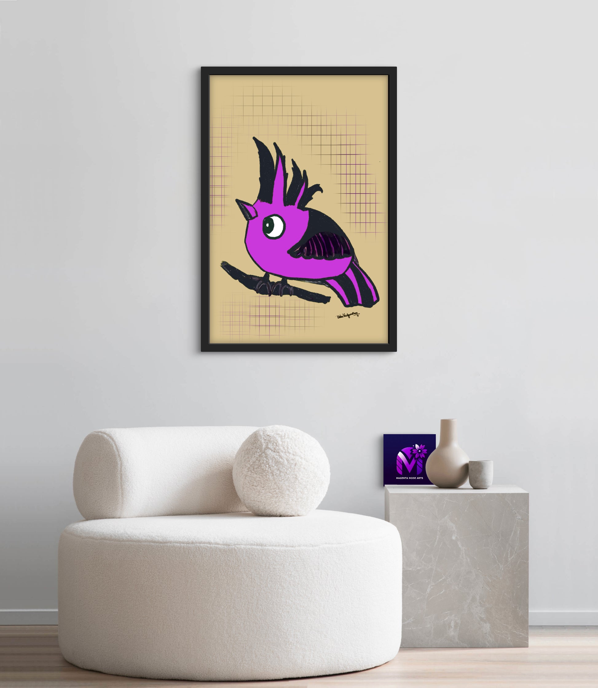 From the artist and palette poet - Magenta Majesty, an imaginary hooded bird art in our brand's colour with a serene beige background.