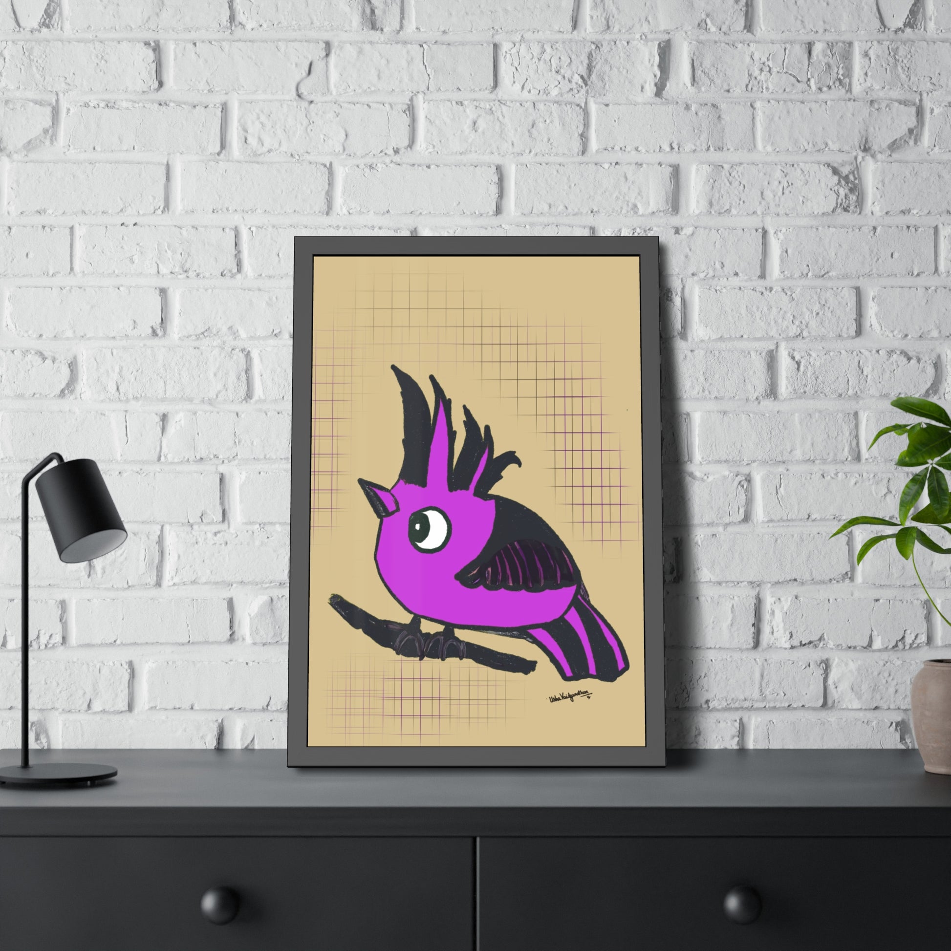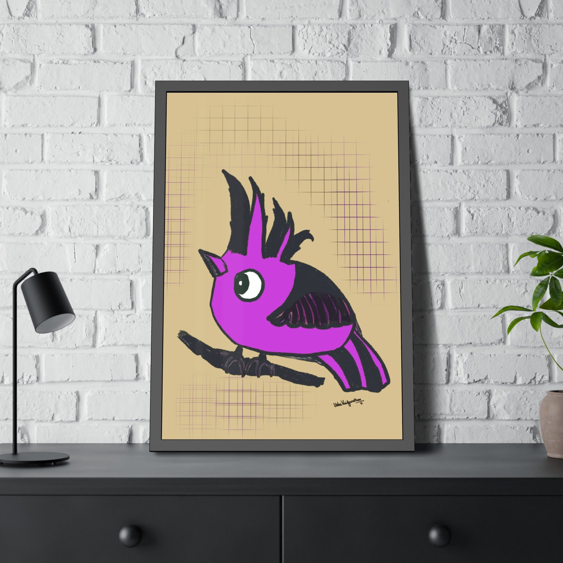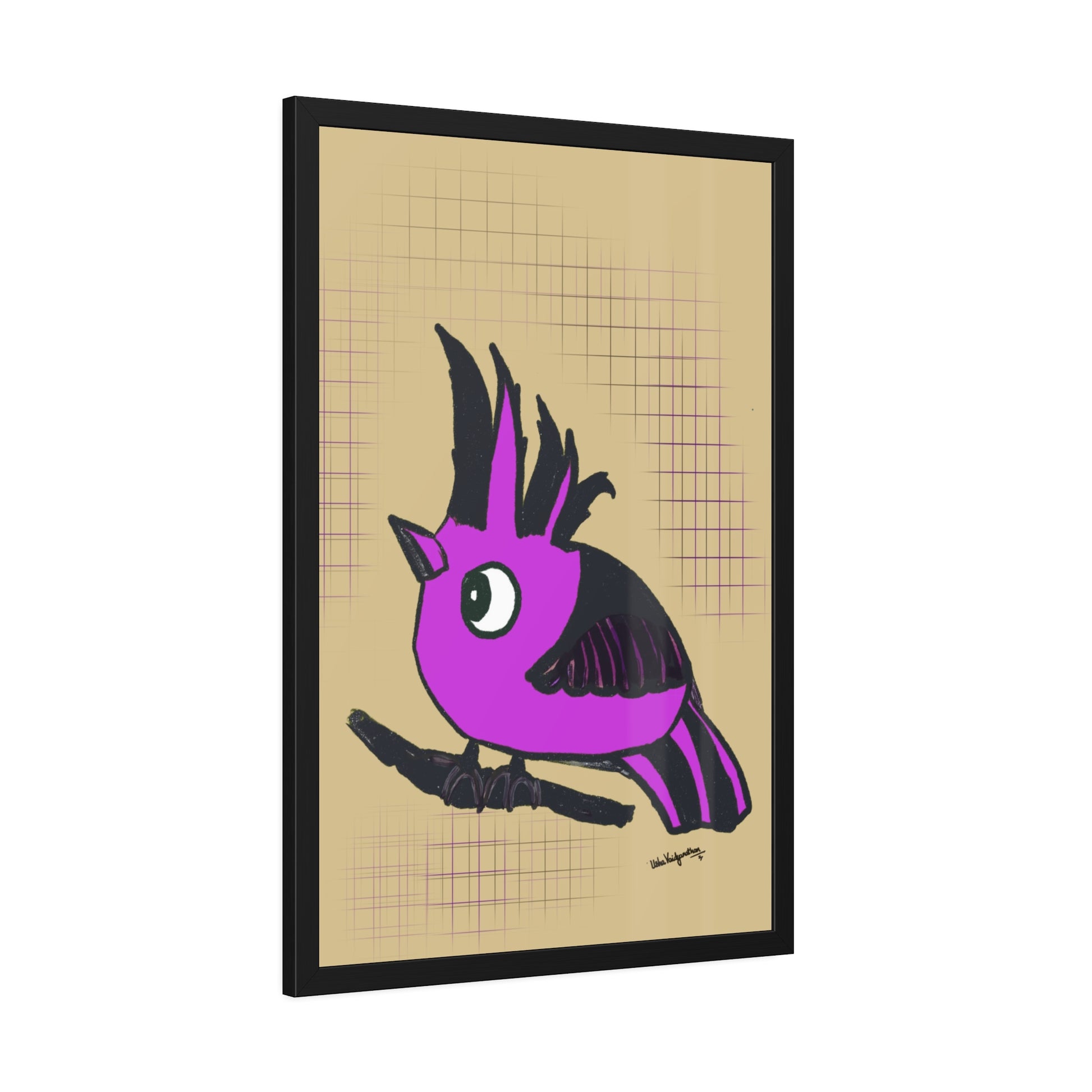 From the artist and palette poet - Magenta Majesty, an imaginary hooded bird art in our brand's colour with a serene beige background.