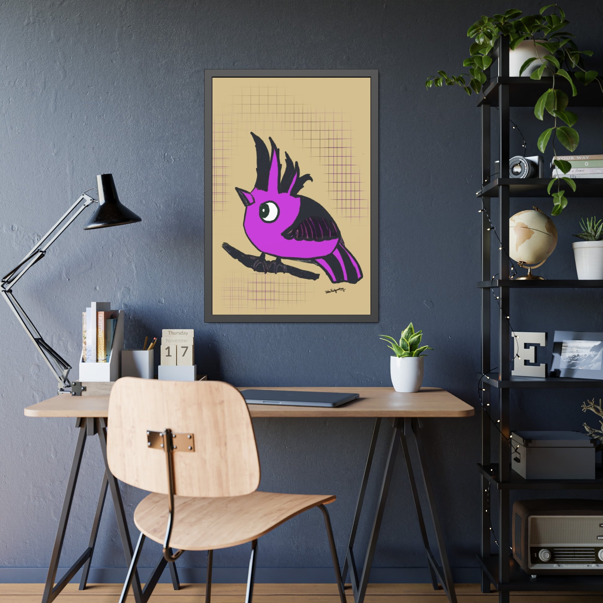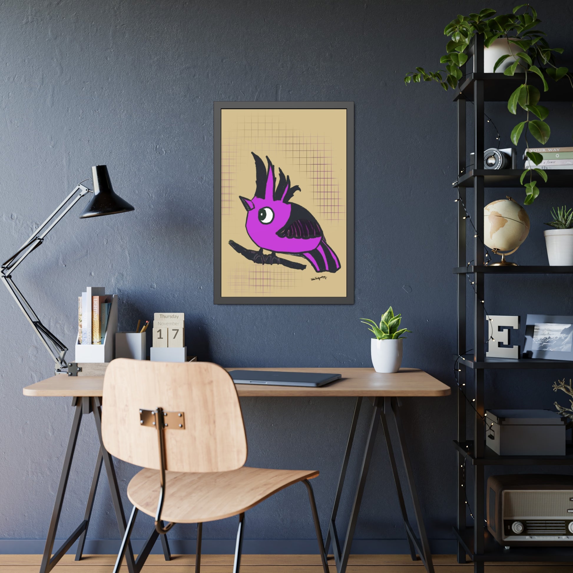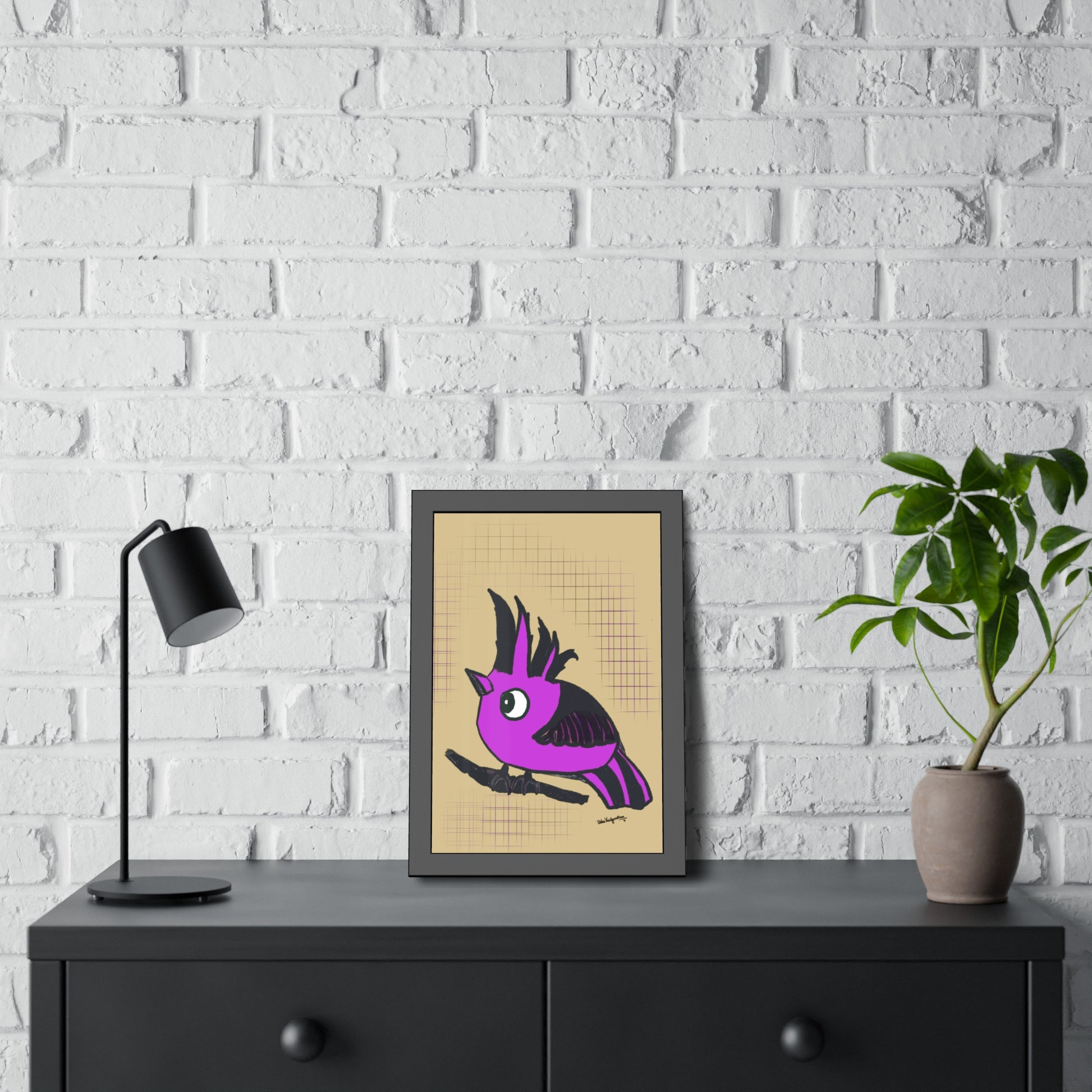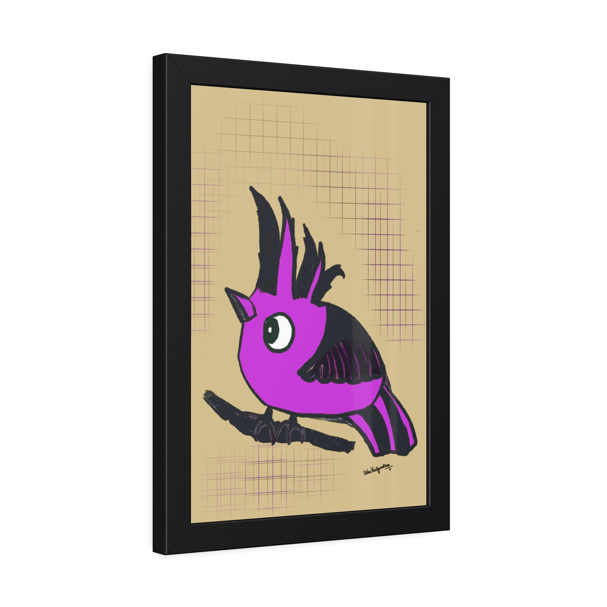 From the artist and palette poet - Magenta Majesty, an imaginary hooded bird art in our brand's colour with a serene beige background.