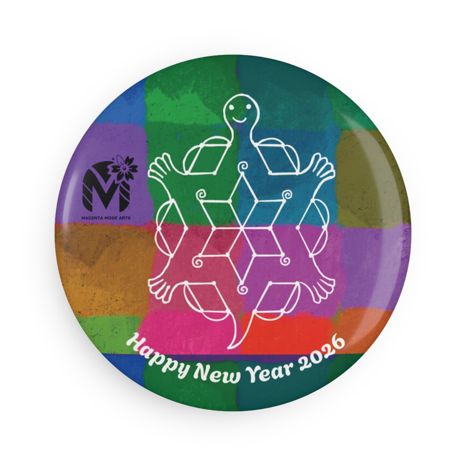 Celebrate the timeless beauty of traditional South Indian art form of kolam with magnets from Magenta Mode Arts. At the heart of this design swim graceful fish and turtle motifs, symbolizing prosperity, longevity, and harmony with nature.