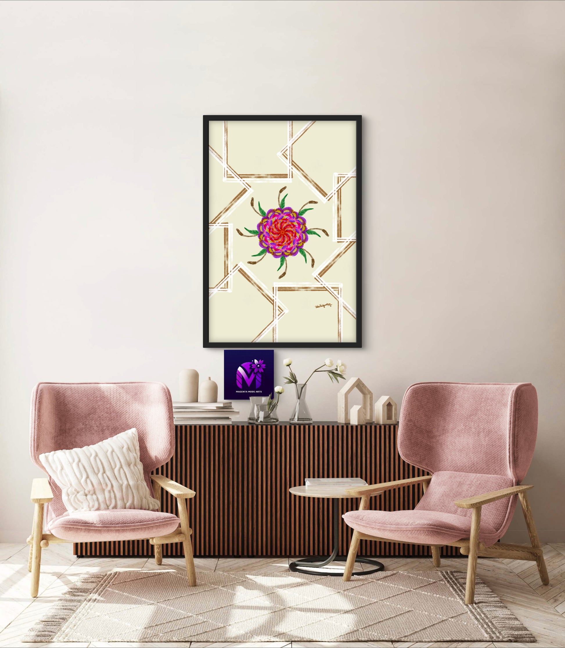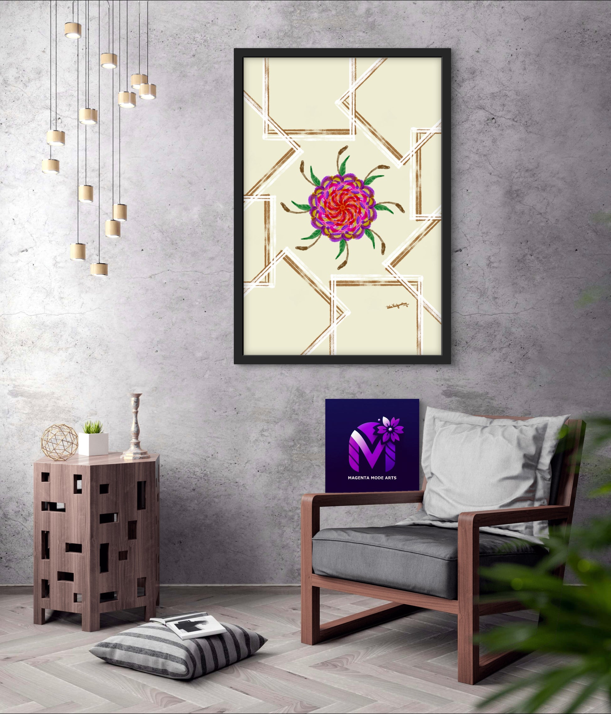 From the artist and palette poet - I created the UV Majenta flower art and made it have striking pop of colours from the UV spectrum with a calming backdrop which enables the flower to enjoy the attention.